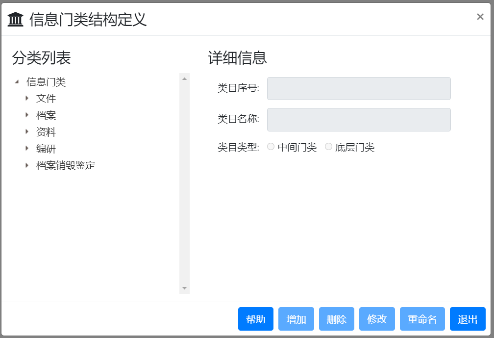 1、门类管理功能移植到前台实现,用户可以方便灵活的进行门类设计;